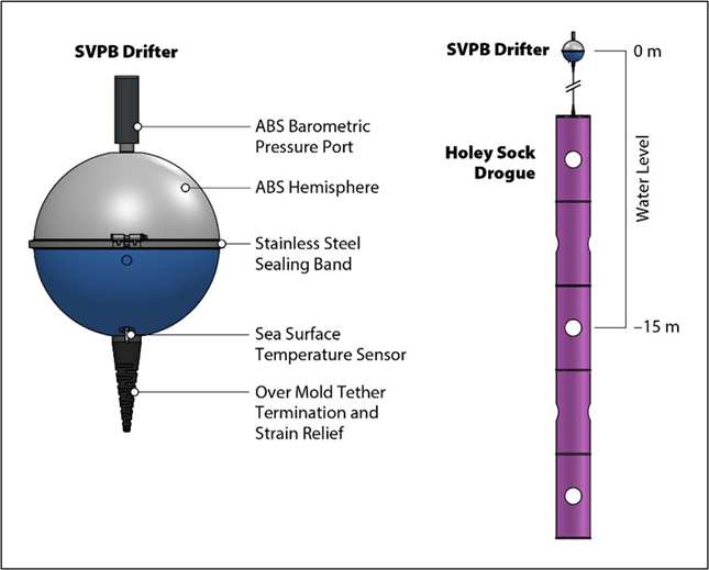 More than 150 E-SurfMar drifting buoys are permanently operating in the EUMETNET Composite Observing System (EUCOS) area. E-SurfMar relies on partner institutions in The Netherlands, Portugal, UK, France, Italy, Germany, Canada and the United States to deploy and maintain the drifting buoy network. Deployments are carried out using various vessels, including container ships, expedition sailboats, and racing yachts. Our goal is to optimise our networks for consistent spatial and temporal coverage. Drifting buoys, designed to track surface currents, have a hemispheric shape and include a holey sock drogue (sea anchor) at a standard depth of 15 metres below the surface. These buoys use GPS to measure their position and transmit surface air pressure and sea surface temperature data in real time via the Iridium satellite communication system. By analysing multiple reports from different positions, we can estimate near-surface ocean currents. The average operational lifespan of a drifting buoy is approximately 600 days. While sea surface temperature (SST) is important, we primarily focus on atmospheric surface pressure, as this parameter cannot be measured by satellites. A drifting buoy with the drogue (credit Lagrangian drifting laboratory) Drifting Buoys