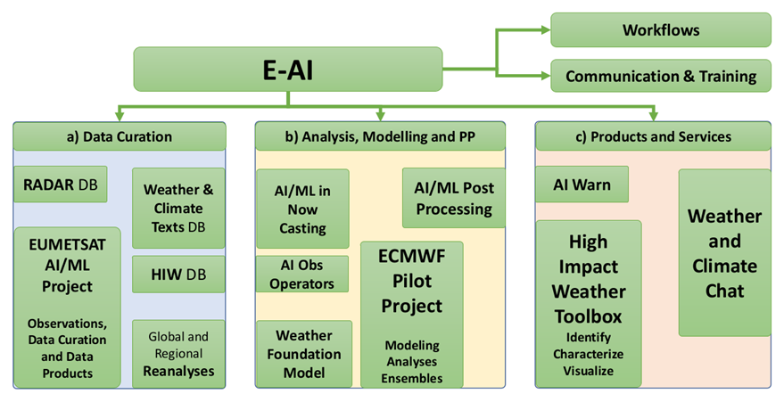 The E-AI programme is structured in three modules: a) Data Curation, b) Analysis, Modelling and Post-Processing, and c) Products and Services. By working together on overarching Workflows, AI/ML can be used effectively across the entire value chain while also addressing necessary technical, administrative, and structural requirements. Moreover, the programme offers Communication and Training opportunities to ensure an efficient flow of information on AI/ML developments within and beyond the E-AI programme.Structure of the E-AI Programme