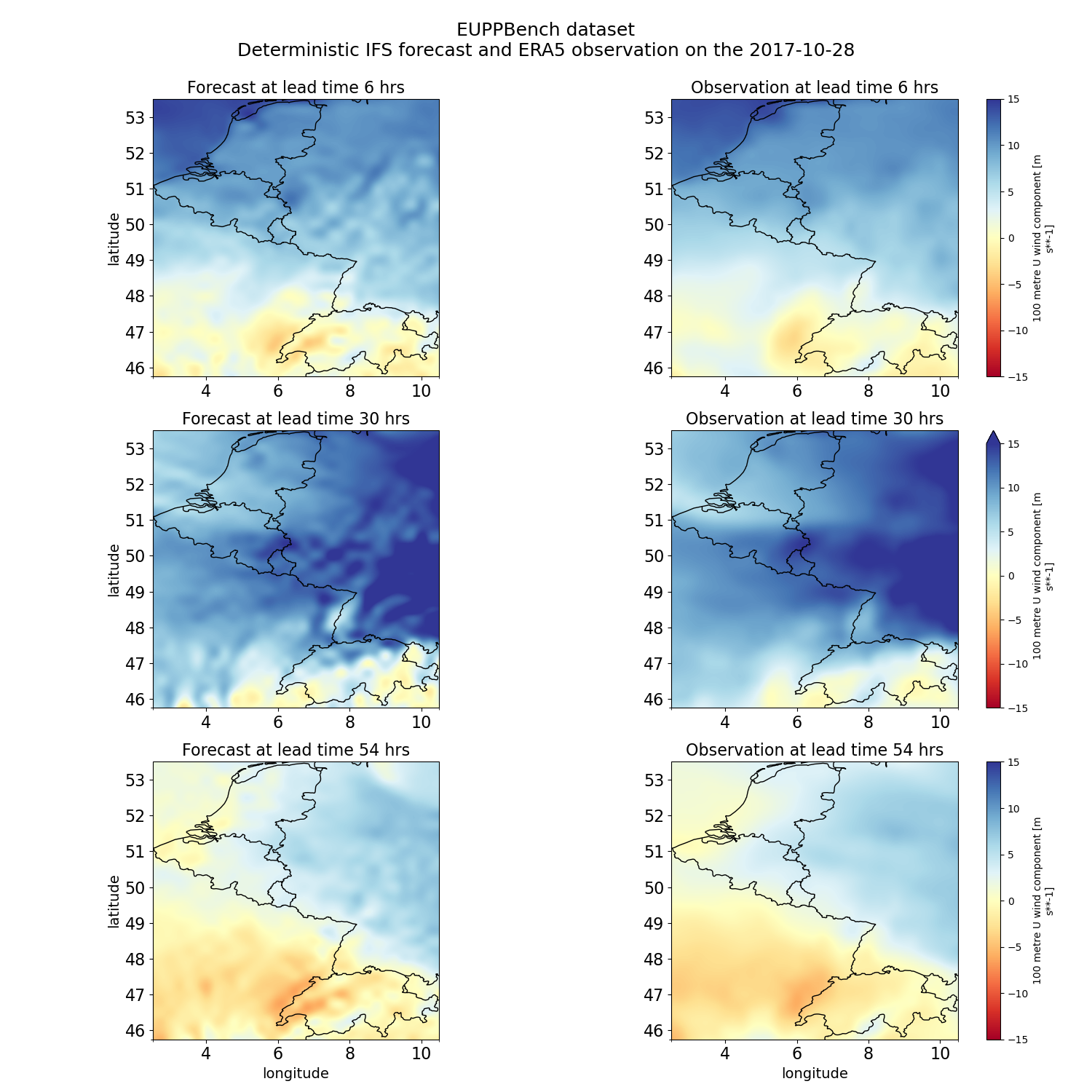 Base dataset – Low-resolution gridded data The benchmark dataset consists of 47 fields, with at least seven requiring post-processing. It includes daily forecasts at midnight, which feature ensemble, control, and high-resolution ECMWF runs, as well as reforecasts twice a week and hourly analysis data. The training set covers 2017 and 2018, while the test set is for 2019. The total size of the gridded benchmark is about 6 terabytes (TB), with the training set being 4.3 TB and the test set 1.6 TB. This dataset provides a solid basis for evaluating and comparing different post-processing methods used by National Meteorological Services. More details about the base dataset can be found at https://eupp-benchmark.github.io/EUPPBench-doc/files/base_datasets.html. EUPPBench datasets The EUPPBench datasets also include station data all over the selected domain and ECMWF forecasts and reforecasts from the nearest grid point. An example of deterministic IFS forecast for 100m u wind and the corresponding gridded observations in the EUPPBench dataset.Benchmark Datasets